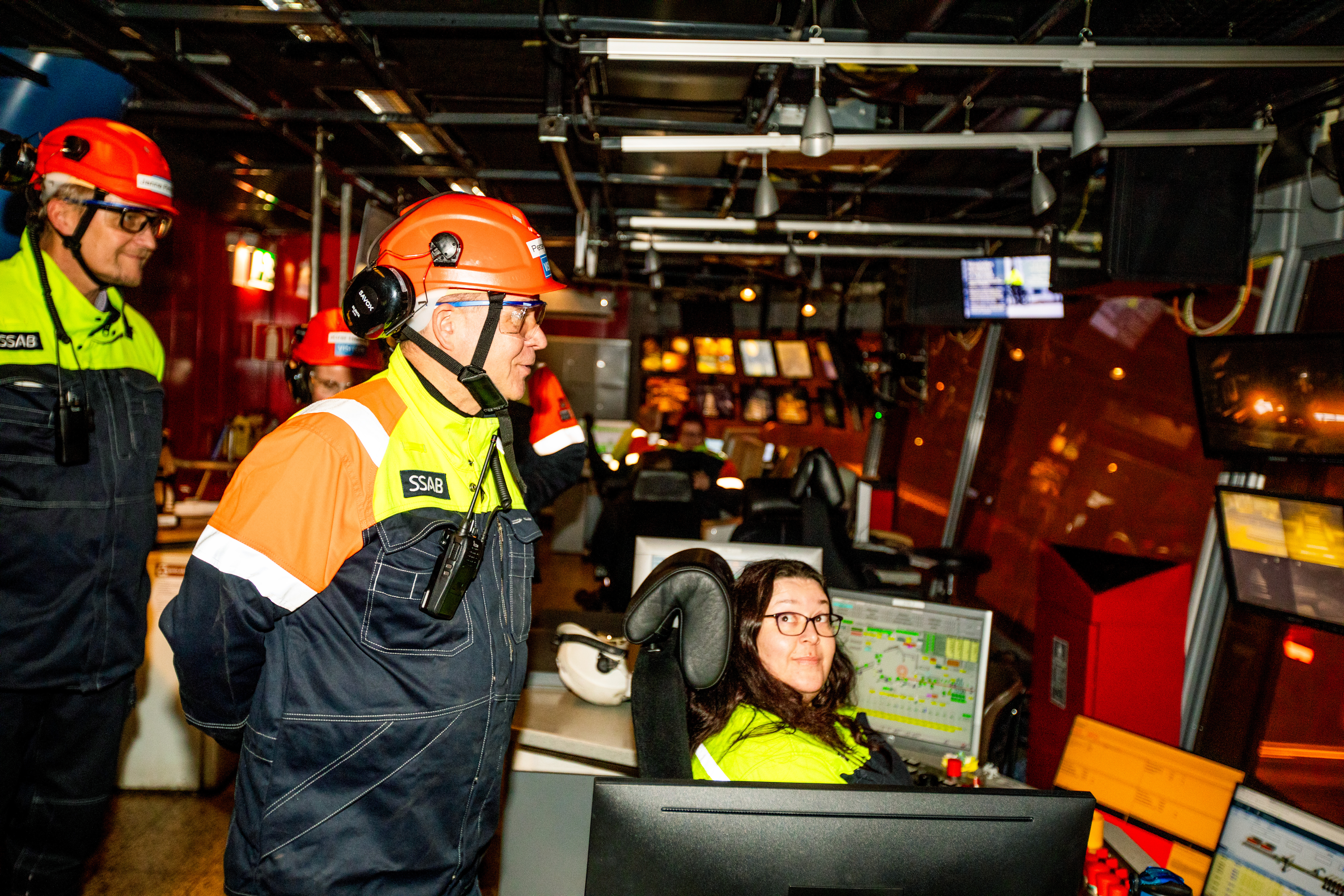 Pääministeri Petteri Orpo keskustelemassa nauhavalssin ohjaamossa operaattori Sonja Impolan kanssa. Taustalla vasemmalla SSAB Europe -divisioonan tuotantojohtaja Janne Pirttijoki. Kuva: Jaakko Mylly
