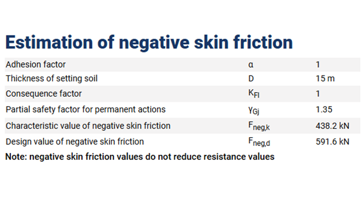 The detailed report shows the input parameters applied in the estimation of negative skin friction and the corresponding estimated loads.